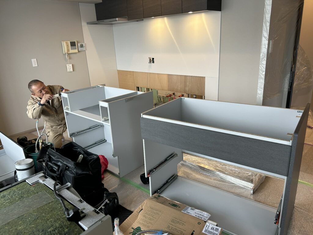 工事開始を行い、まずはシステムキッチンの解体。配管工事にやり替えと電気工事の下準備、キッチン高さアップのためのかさ上げ部材の設置、キッチンの再設置。