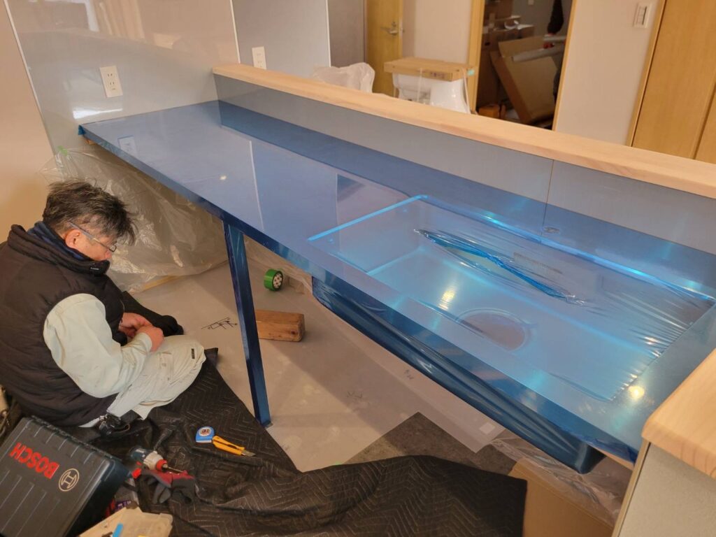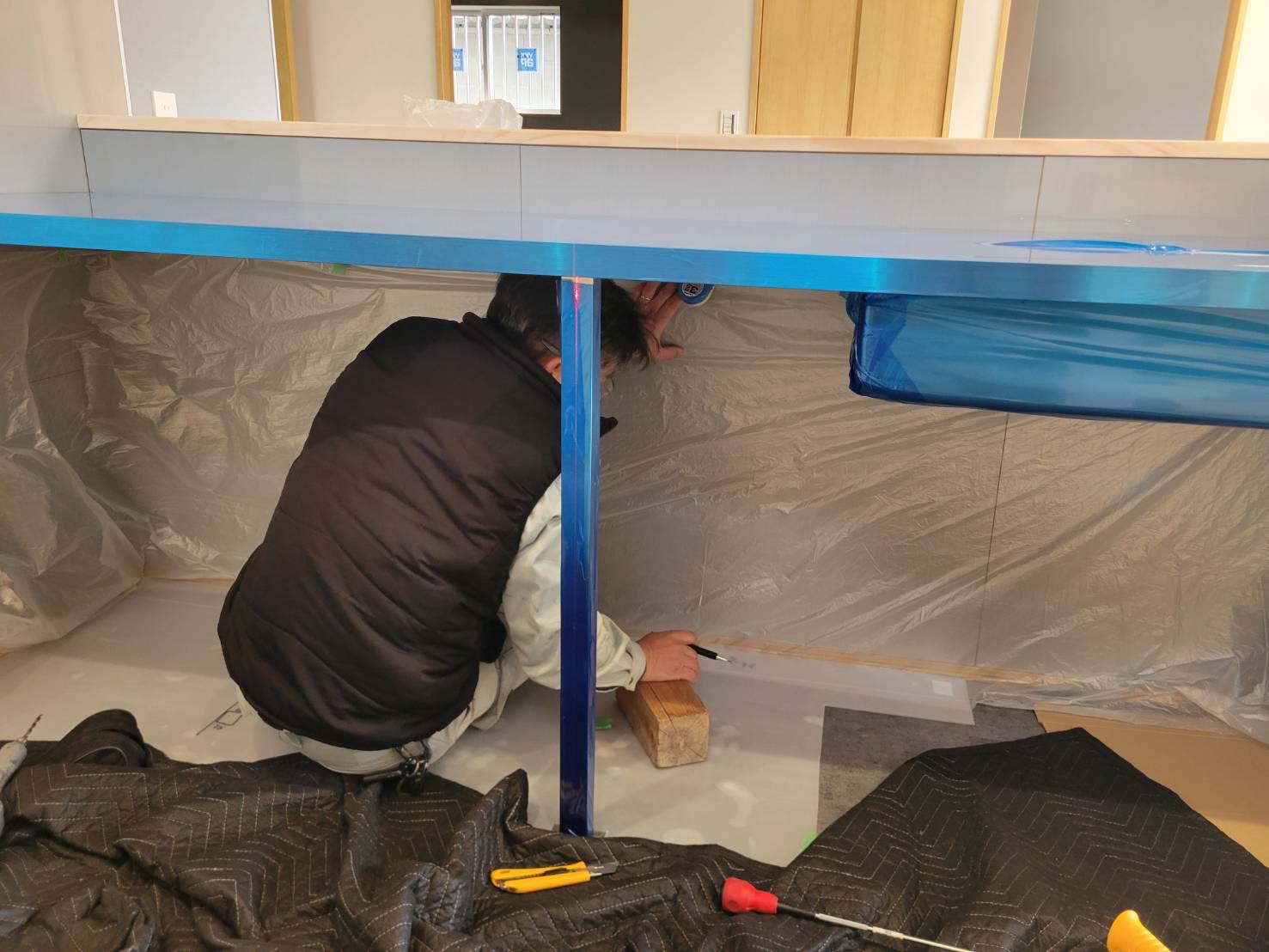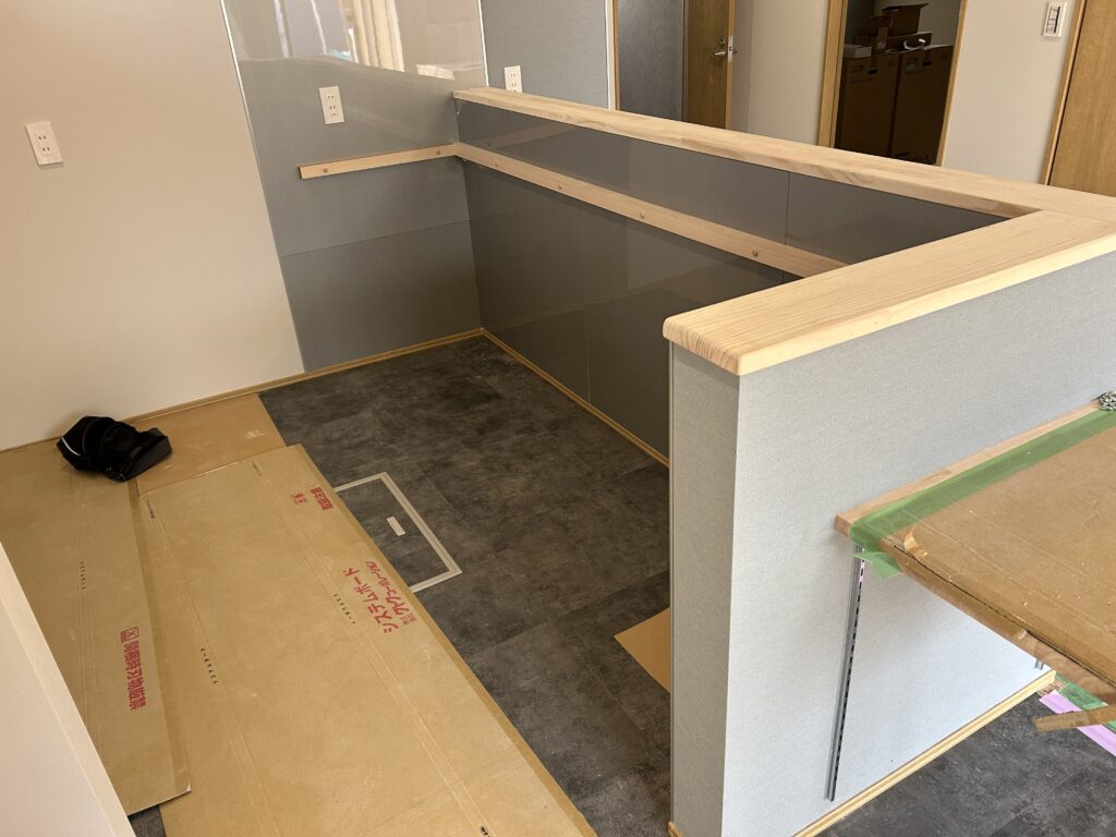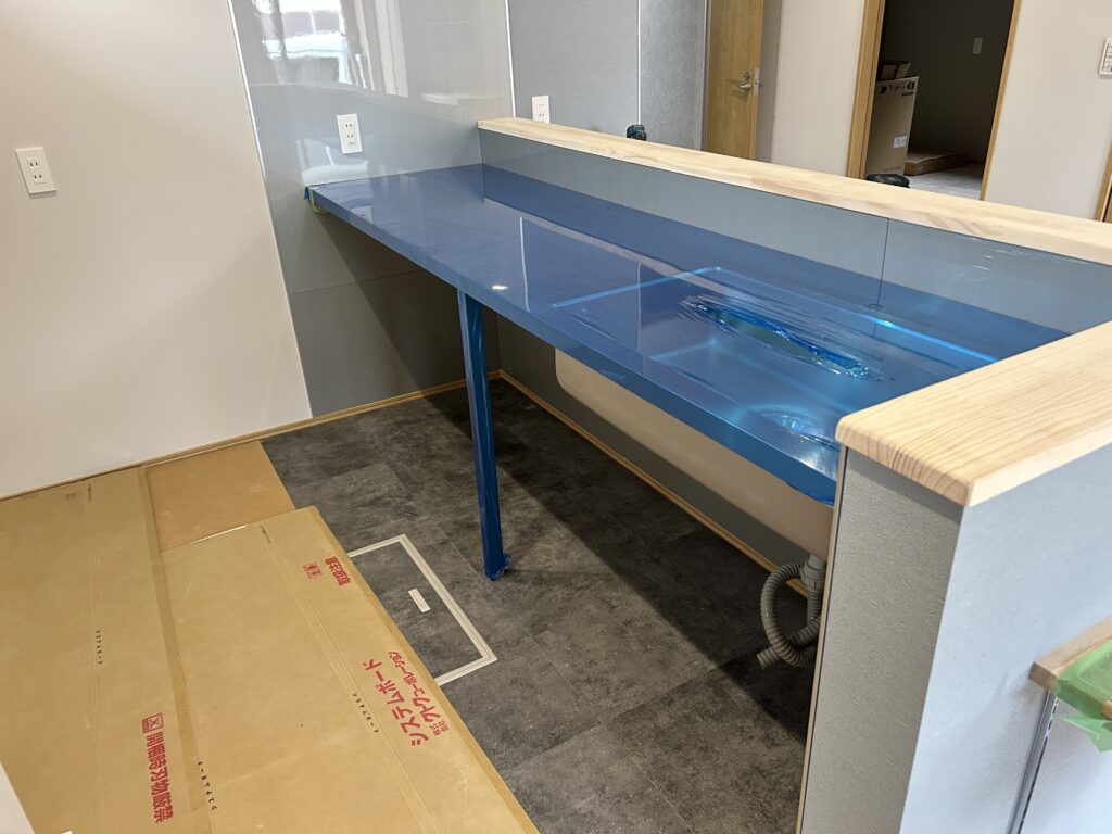 今回、㈱喜創さまには製作前、キッチ天板が載せられように桟木をカウンター側に大工工事でとりつけていたきました。