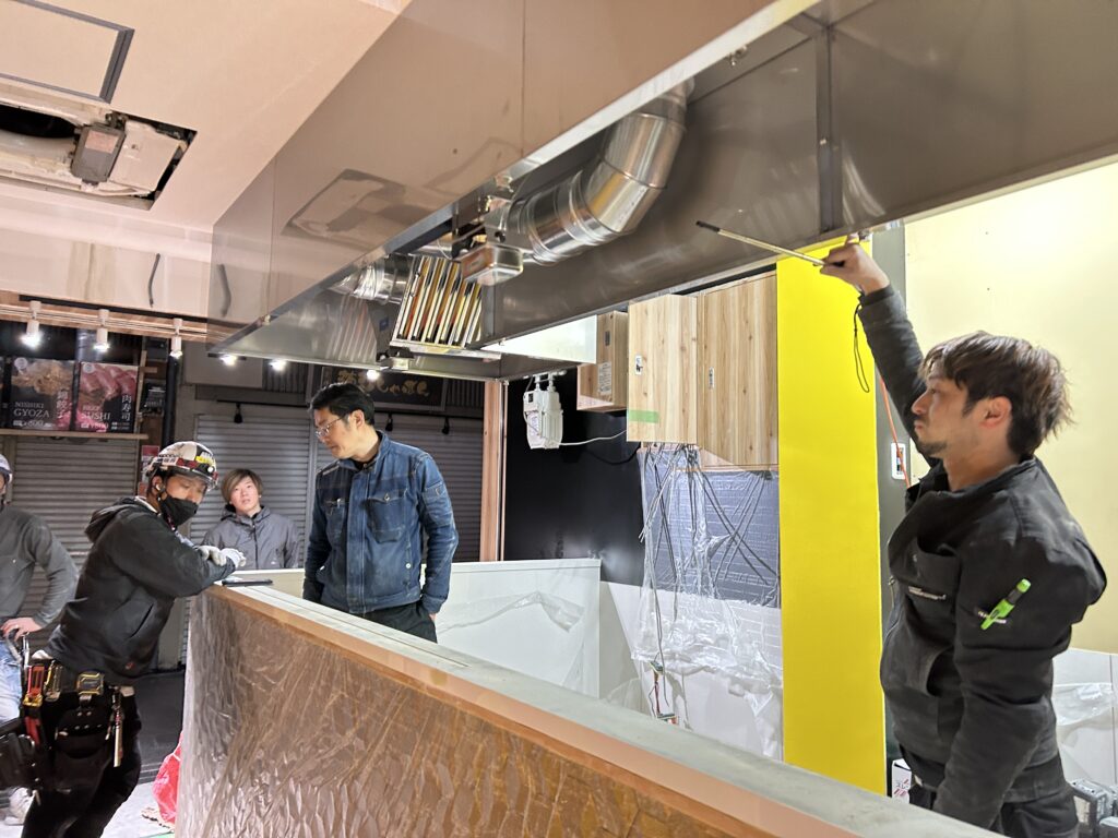 今回は家庭用ではなく京都市の錦市場の店舗工事にステンレスフードを夜間設置工事させていただきました。